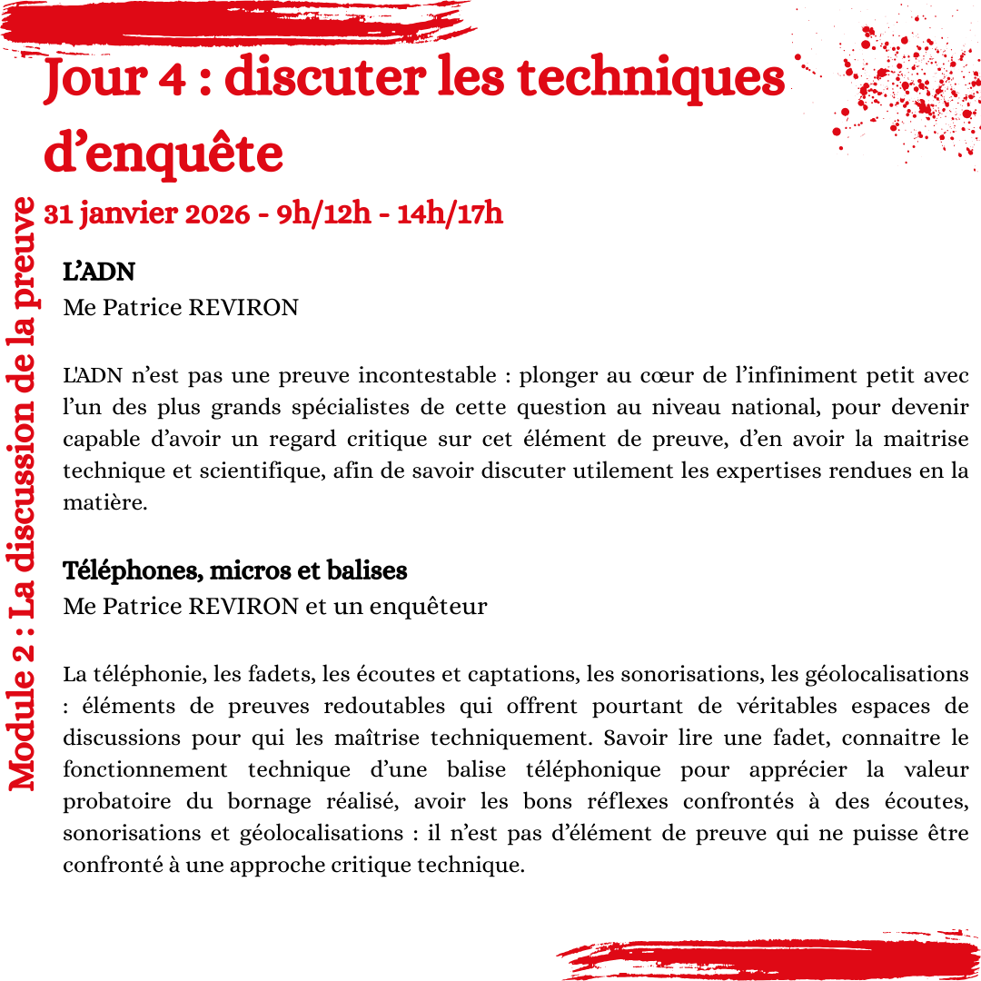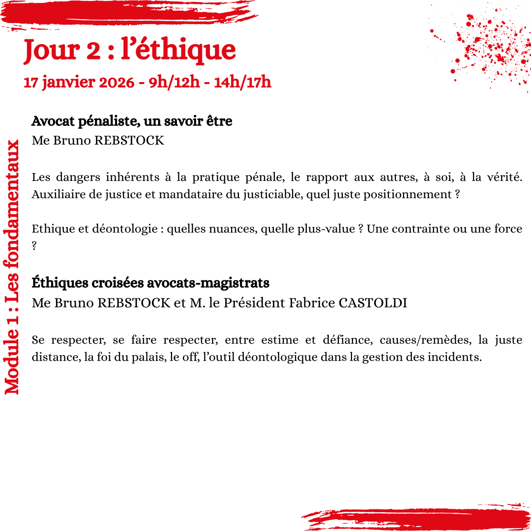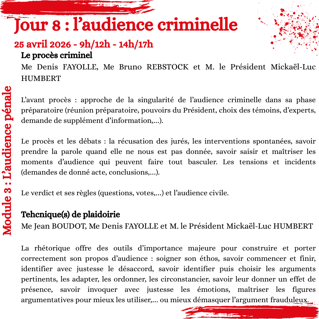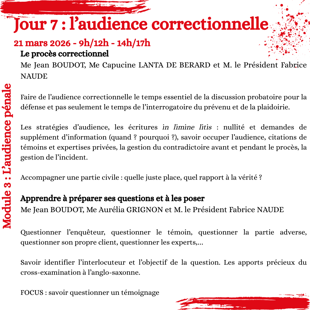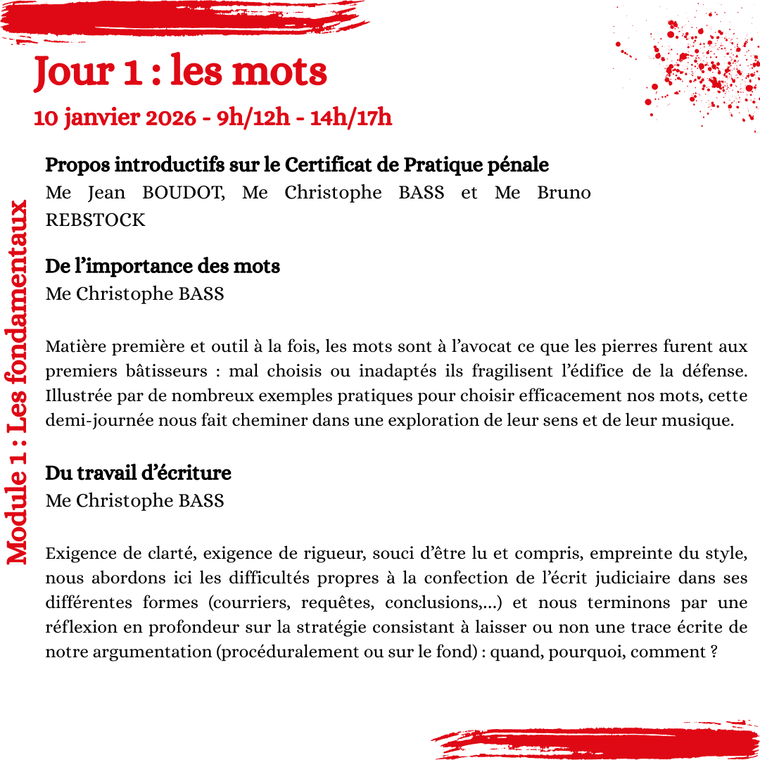 Le programme proposé par l’Atelier de Pratique Pénale est présenté sous forme de cycle de formation à destination des avocats, des élèves-avocats et des étudiants de Master, traitant méthodiquement des situations et questions auxquelles se trouvent confrontés les avocats pratiquant la barre pénale, et ci-après détaillé.
