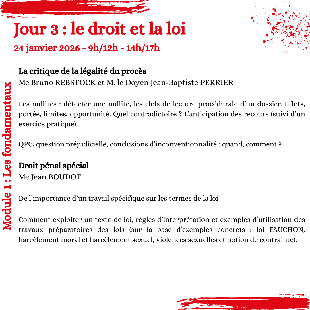 Sur les dix journées de formation, certaines demi-journées porteront sur des programmes spécifiques réservés pour les uns aux avocats, inscrits dans le parcours perfectionnement, et pour les autres aux étudiants et élèves-avocats, inscrits dans le parcours initiation, de façon à adapter la difficulté des exercices pratiques proposés aux prérequis de chacun.