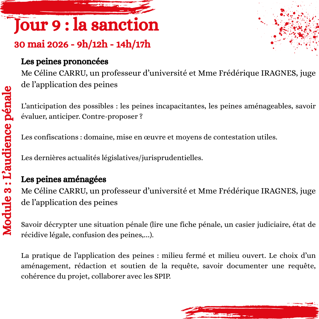 Les 60 heures de leçons pratiques ainsi proposées dix thèmes en dix journées sont validées par un Certificat de Pratique Pénale délivré par la Faculté de droit d’Aix-Marseille Université.